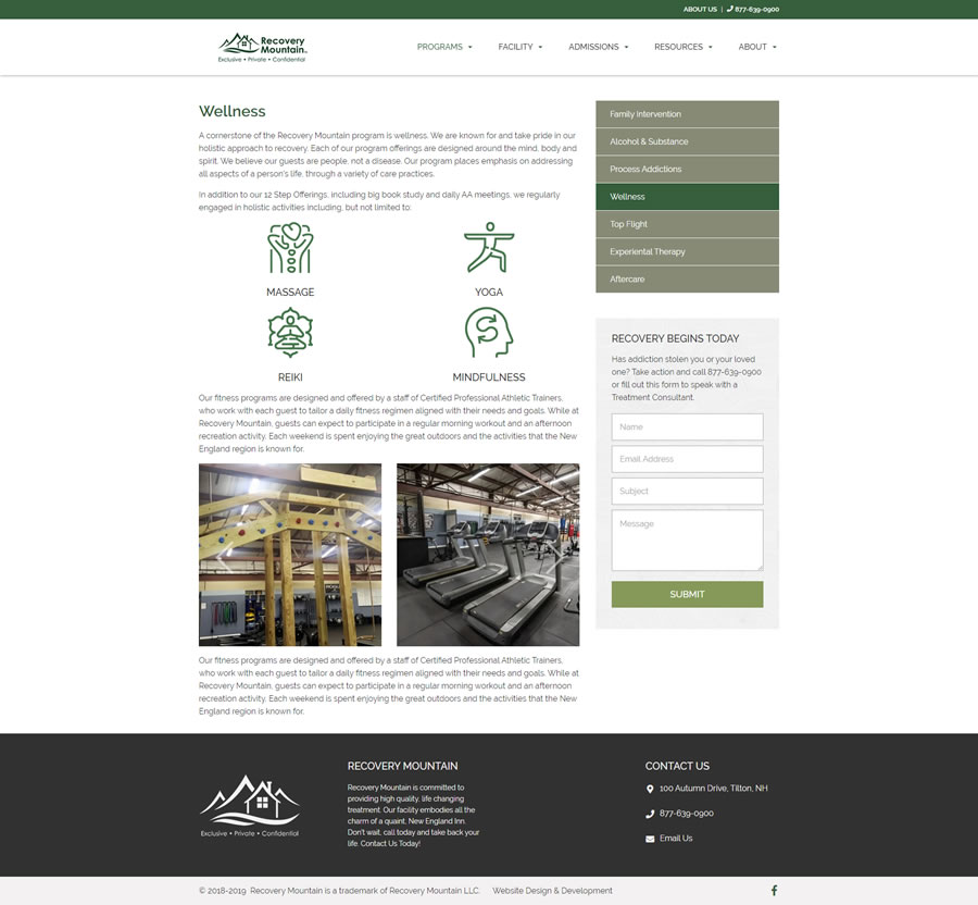 Recovery Mountain is a unique holistic wellness center, tucked away on a hillside in charming central NH. Their unique campus style wellness center is designed to provide each guest with the knowledge, tools, and skills needed to achieve long term sobriety. Their relaxing, private environment is like none other, featuring private and semi private rooms, a country kitchen in which meals are prepared and served, a state of the art training facility in which fitness and team building activities are undertaken, a turf field utilized for training activities, bright, airy group meeting spaces utilized for life coaching, yoga, massage and of course, their facility embodies all the charm of a quaint, New England Inn. Whether the sun is shining, the foliage is in bloom or the snow is falling, our guests can expect to enjoy all the outdoor recreation our region is known for, while addressing alcohol or chemical dependencies.